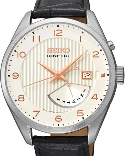 Seiko Core watch model SRN049 powered by Seiko kinetic movement. Steel case. White color dial with date and day pointer hand. Black leather strap. 100 meters water resistant.