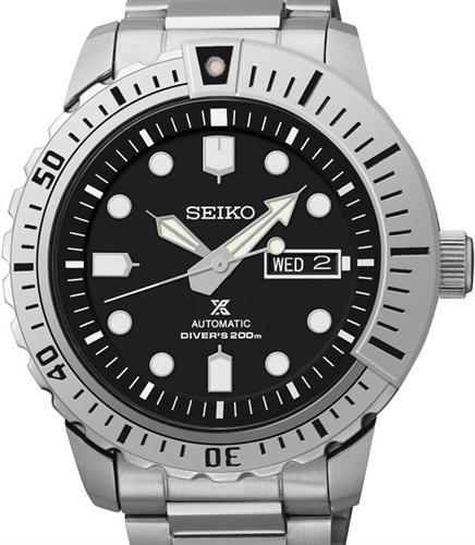 Seiko Prospex Automatic Diver watch model SRP585. Stainless steel case and bracelet. One-way rotating 0-60 bezel. Black color dial with day/date calendar and large luminous hands and markers. Water resistant to 200 meters.