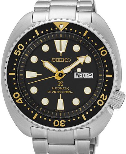 Seiko Prospex Automatic Diver watch model SRP775. Stainless steel case and bracelet. One-way rotating 0-60 bezel. Black color dial with day/date calendar and large luminous hands and markers. Yellow color accents on bezel and dial. Water resistant to 200 meters.