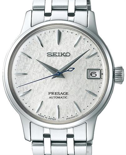 Seiko SRP843 automatic Ladies wrist watch from Seiko Presage Cocktail Time Collection - Snow Dial pattern. 50m Water Resistant. SEIKO Japanese made 23 jewel Automatic movement 4R35 with Date calendar. Stainless steel case, screw-down crown and observation case back. Silver color textured dial. On bracelet.