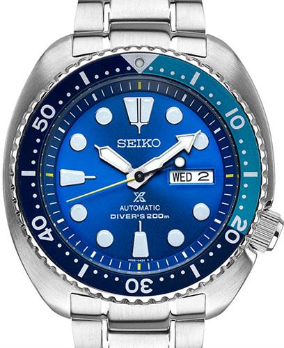 Seiko Prospex SRPB11 "Blue Lagoon Turtle". Limited edition. Japanese automatic movement housed in the popular "Turtle" style stainless steel case. Blue dial with a light blue rotating bezel. Day & date function. Comes on a stainless steel bracelet and with extra black silicone rubber. Water resistant to 200m.
