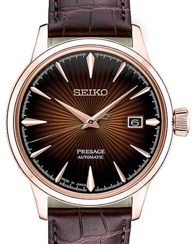 Seiko SRPB46 automatic wrist watch from Seiko Presage Cocktail time Collection "Sweet". 50m Water Resistant. SEIKO Japanese made 23 jewel Automatic movement with Date calendar. Rose gold plated stainless steel case, screw-down crown and observation case back. Brown textured dial. On brown leather band.