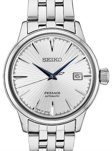 Seiko SRPB77 automatic wrist watch from Seiko Presage Cocktail Time Collection - Dry. 50m Water Resistant. SEIKO Japanese made 23 jewel Automatic movement with Date calendar. Stainless steel case, screw-down crown and observation case back. Silver color textured dial. On bracelet.