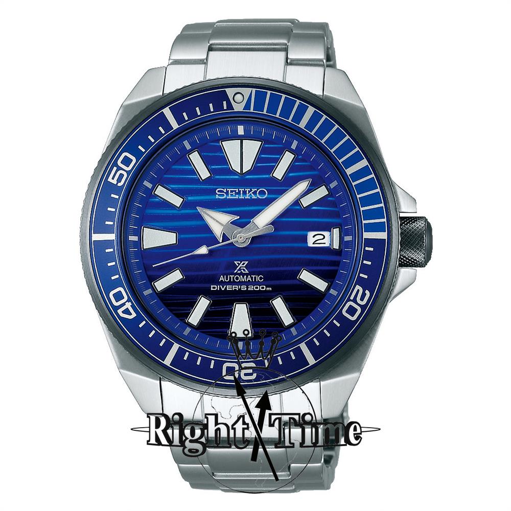 Seiko Prospex model SRPC93, special edition "Save the Ocean". Seiko solid stainless steel "Samurai" case. Japanese automatic movement in caliber 4R35. New "Save the ocean" wave style blue gradient dial with luminous hands and markers. Ratcheted rotating bezel with dual color blue color. Dive rated to 200 meters water resistant.
