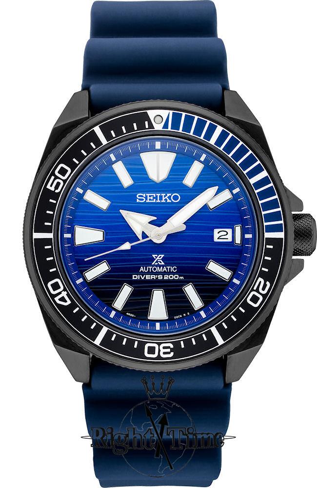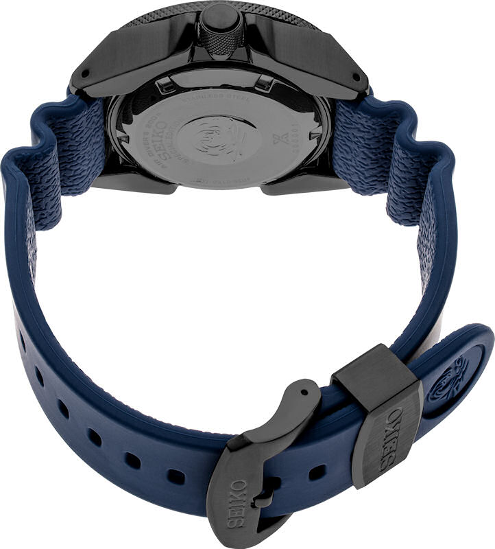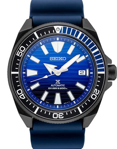 Seiko Prospex Automatic Diver watch model SRPD09. Black Ion Finished stainless steel case with blue rubber band. Uni-directional rotating bezel with 60 minute scale. Stunning blue to black gradient dial with wave pattern. Luminous hands and markers. Water resistant to 200 meters.