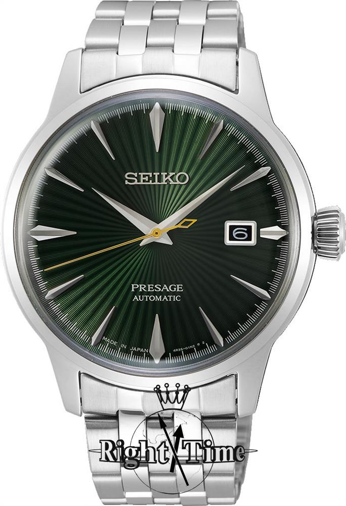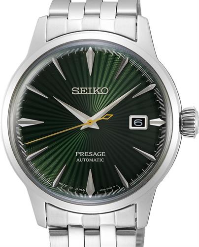 Seiko Presage model SRPE15. Stainless steel case and bracelet. Textured green dial with steel tone hands and markers. Domed mineral glass crystal. Seiko Cal 4R35 automatic movement.
