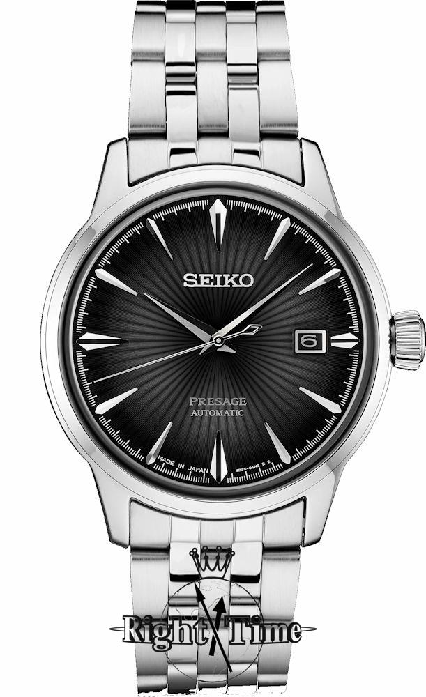 Seiko Presage model SRPE17. Stainless steel case and bracelet. Textured black dial with steel tone hands and markers. Domed mineral glass crystal. Seiko Cal 4R35 automatic movement.