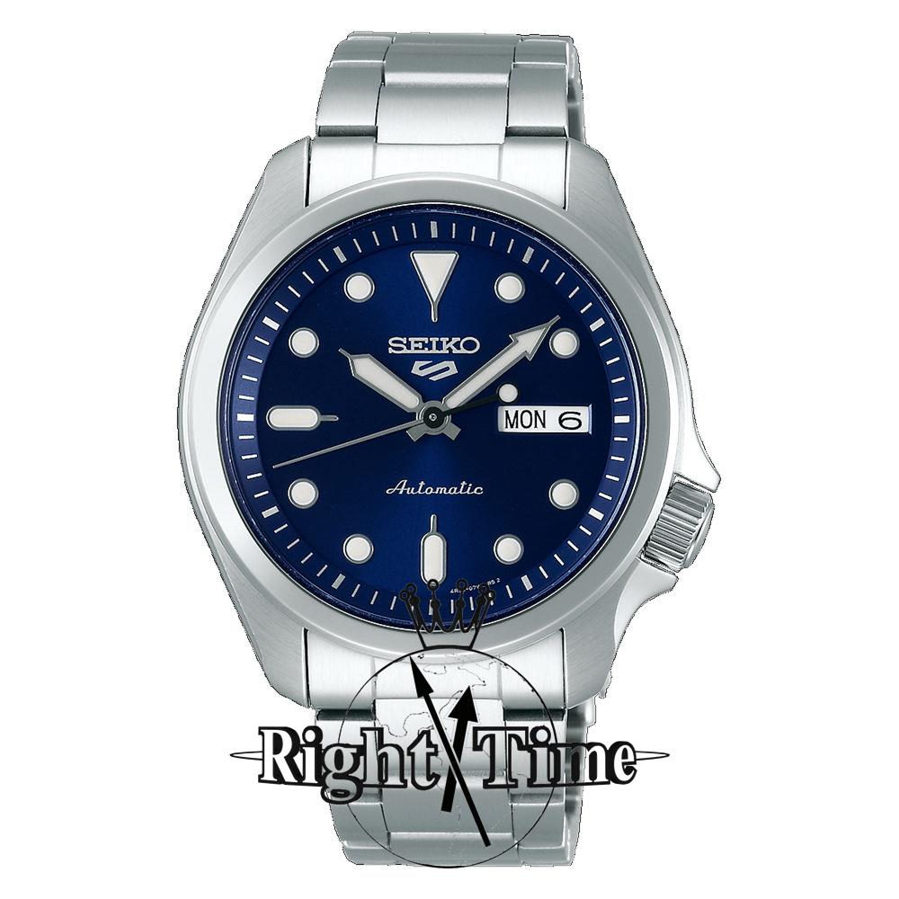 Seiko 5 model SRPE53 sport style wrist watch 100m water resistant, powered by SEIKO 24 jewels 4R36 Japanese Automatic movement with Day/Date calendar. Stainless steel case with bracelet. Blue dial. Lumibrite hands and markers.