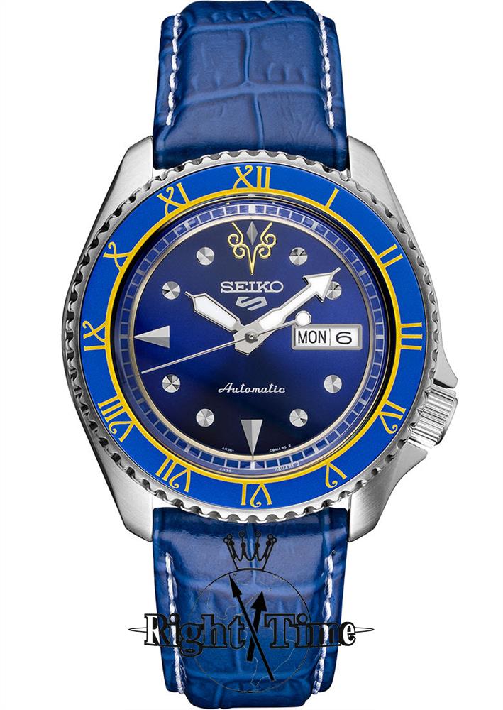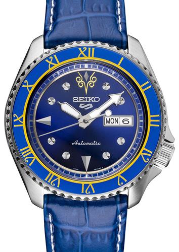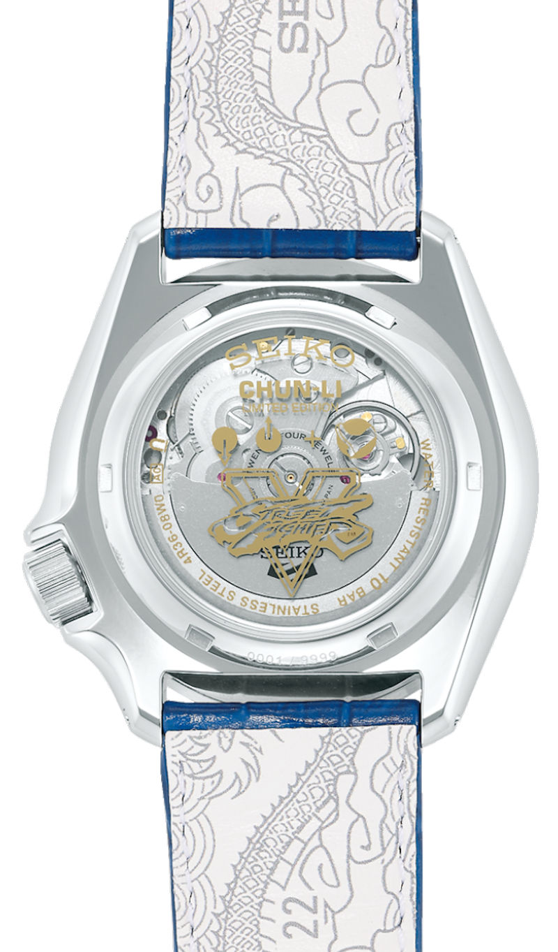 Limited Edition collaboration between Seiko 5 and Capcom brings the Street Fighter collection. Model SRPF17 is dedicated to the exquisite kicking master Chun-Li. The watch is powered by the Japan made Seiko 4R36 automatic movement. Stainless steel case on a blue leather strap. Stunning glossy blue dial with polished steel tone markers and Lumibrite filled hands. Uni-directional bezel with blue and gold color insert. Water resistant to 100 meters.
