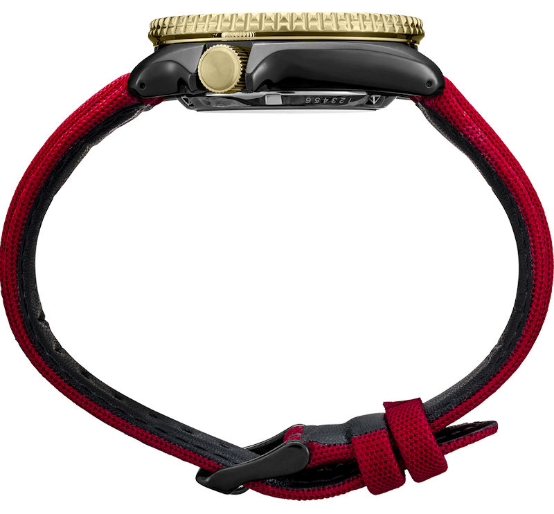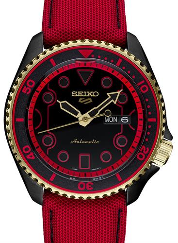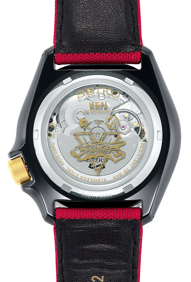 Limited Edition collaboration between Seiko 5 and Capcom brings the Street Fighter collection. Model SRPF20 is dedicated to the heir to the Masters Foundation, Ken. The watch is powered by the Japan made Seiko 4R36 automatic movement. Black PVD coated stainless steel case. Black dial with red accents. Gold tone LumiBrite filled hands. Uni-directional gold plated bezel with black/red 60 minute insert. Red textile strap with black stitching. Water resistant to 100 meters.