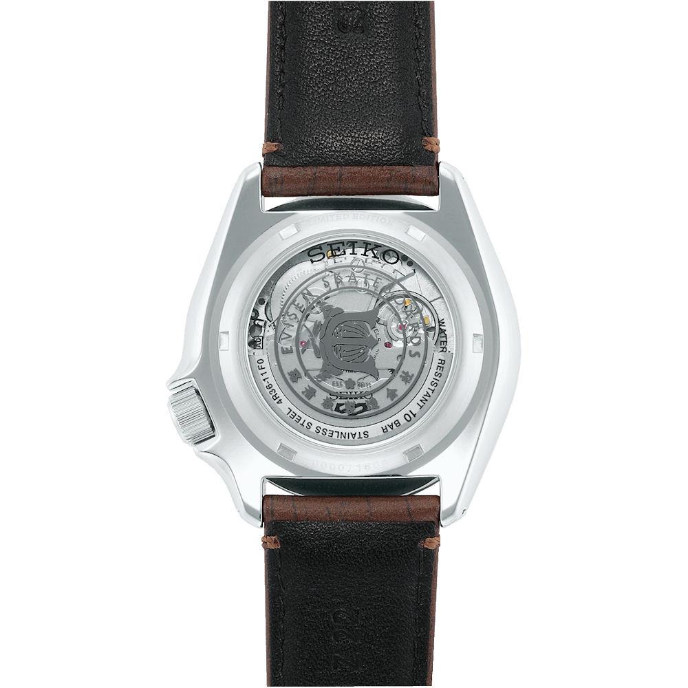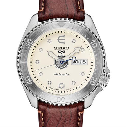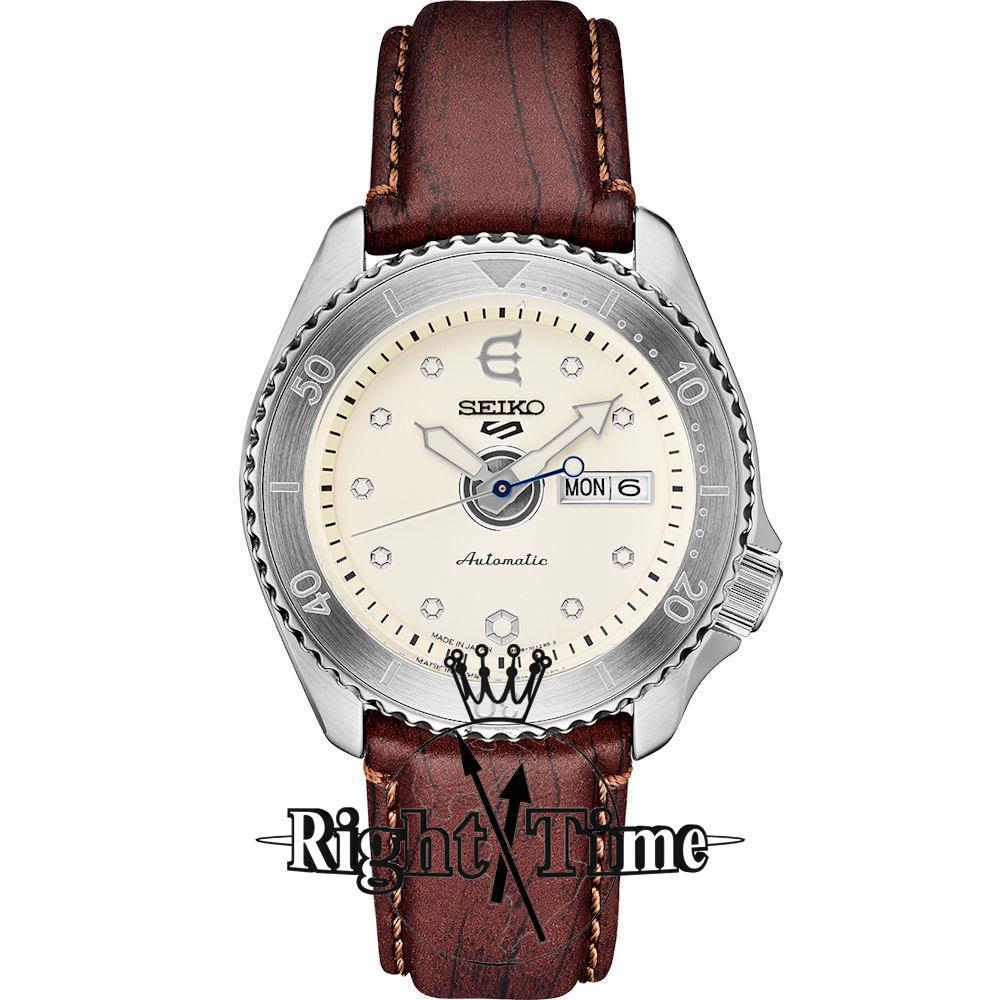 Seiko 5 Evisen Skateboards Limited Edition of 1500 pieces. Model SRPF93. The watch is powered by the Japan made Seiko 4R36 automatic movement. Stainless steel case with brown leather band. White dial with Lumibrite hands. Uni-directional bezel. Water resistant to 100 meters.