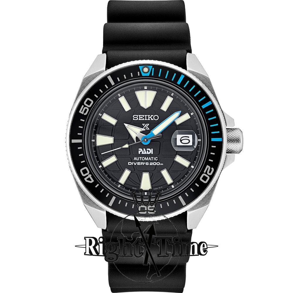 Seiko Prospex PADI model SRPG21. Seiko solid stainless steel case. Japanese automatic movement. Black dial with luminous hands and markers. Ratcheted rotating bezel with blue color accents. Black silicone rubber strap. Dive rated to 200 meters water resistant.