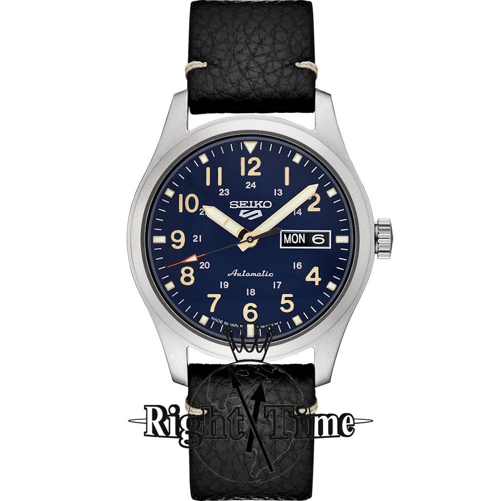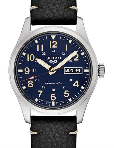 Seiko 5 SRPG39 sport wrist watch 100m water resistant, powered by SEIKO 24 jewels 4R36 Japanese Automatic movement with Day/Date calendar. Stainless steel case with black leather band. Navy blue dial with Lumibrite hands and markers.