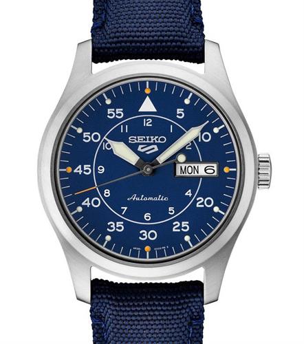 Seiko 5 SRPH31 Sports Field/Military Flieger wrist watch. 100m water resistant, powered by SEIKO 24 jewels 4R36 Japanese Automatic movement with Day/Date calendar. Stainless steel case with blue canvas strap. Blue dial with Lumibrite hands and markers.