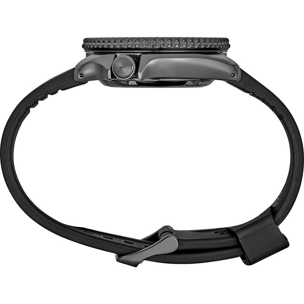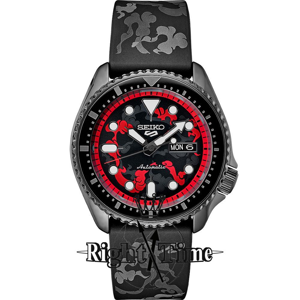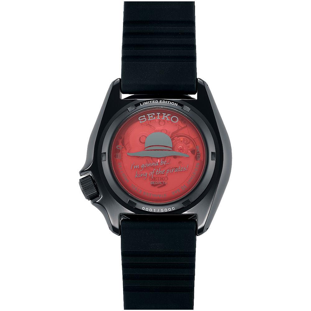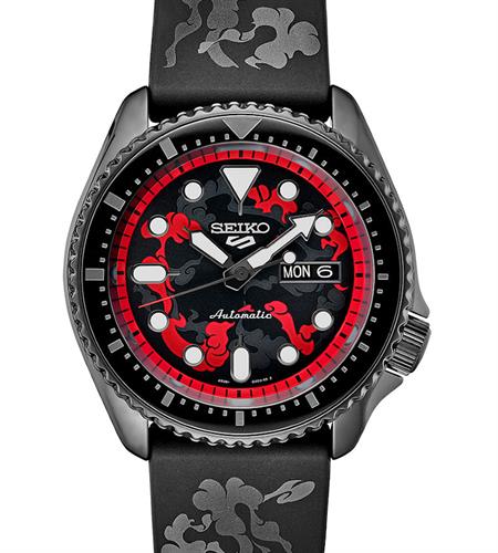 Seiko 5 SRPH65 wrist watch. Limited edition of 5,000 pieces. 100m water resistant, powered by SEIKO 24 jewels 4R36 Japanese Automatic movement with Day/Date calendar. Black plated stainless steel case with rotating bezel. Black dial with red color accents. Black rubber band with design