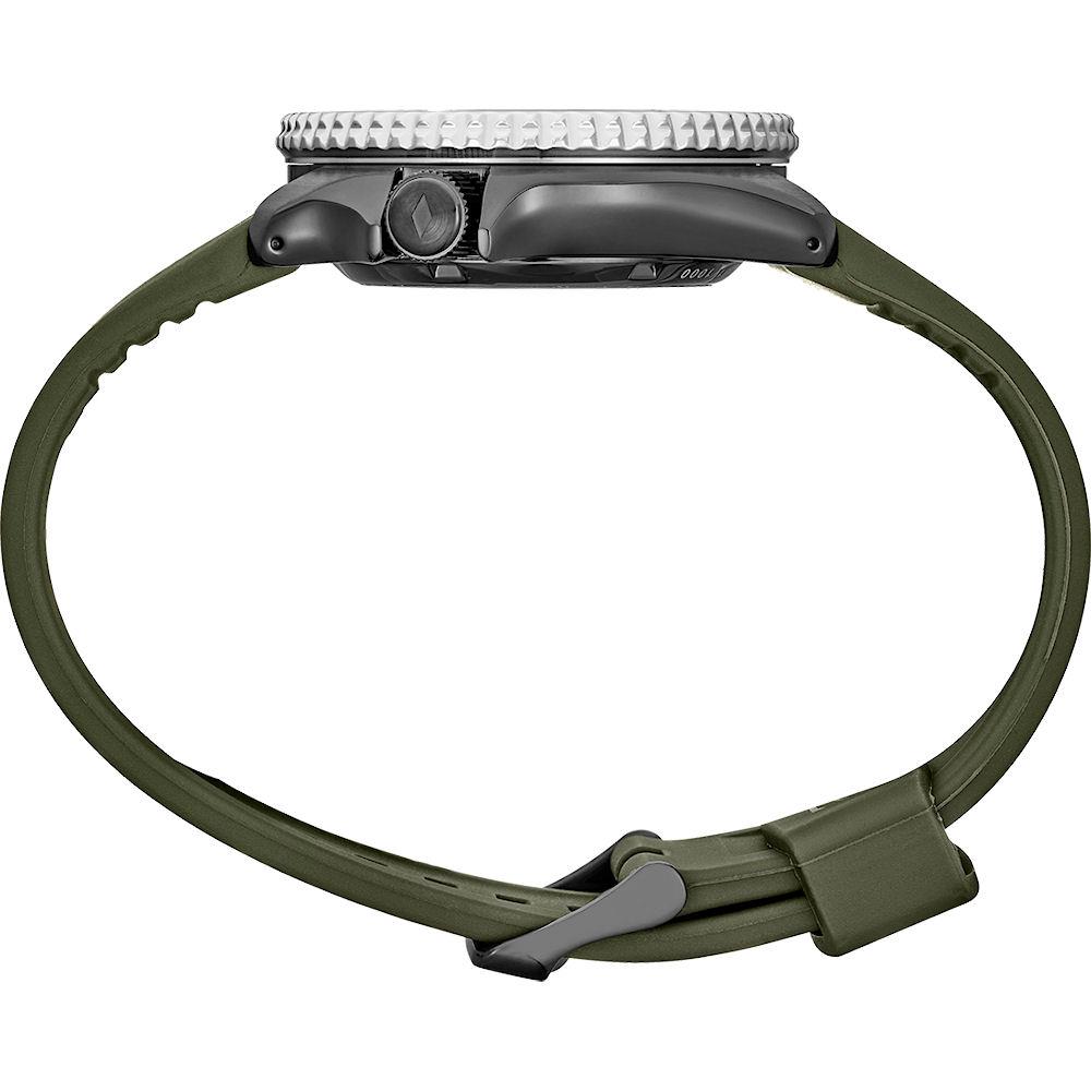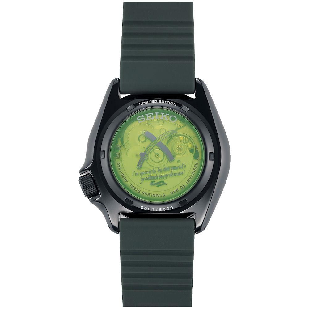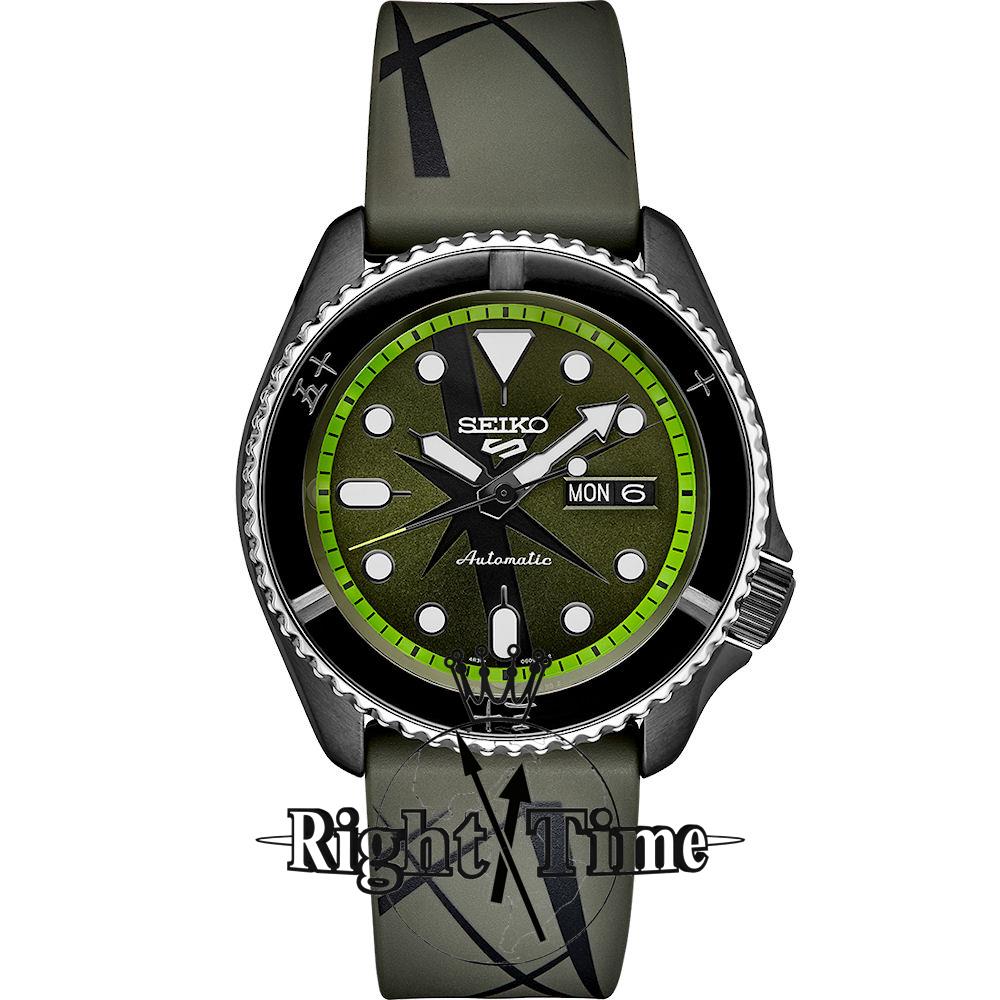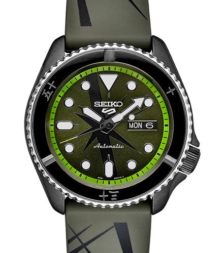 Seiko 5 SRPH67 wrist watch. Limited edition of 5,000 pieces. 100m water resistant, powered by SEIKO 24 jewels 4R36 Japanese Automatic movement with Day/Date calendar. Black plated stainless steel case with rotating bezel. Green dial. Black rubber band with design
