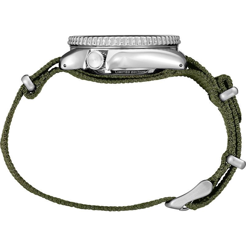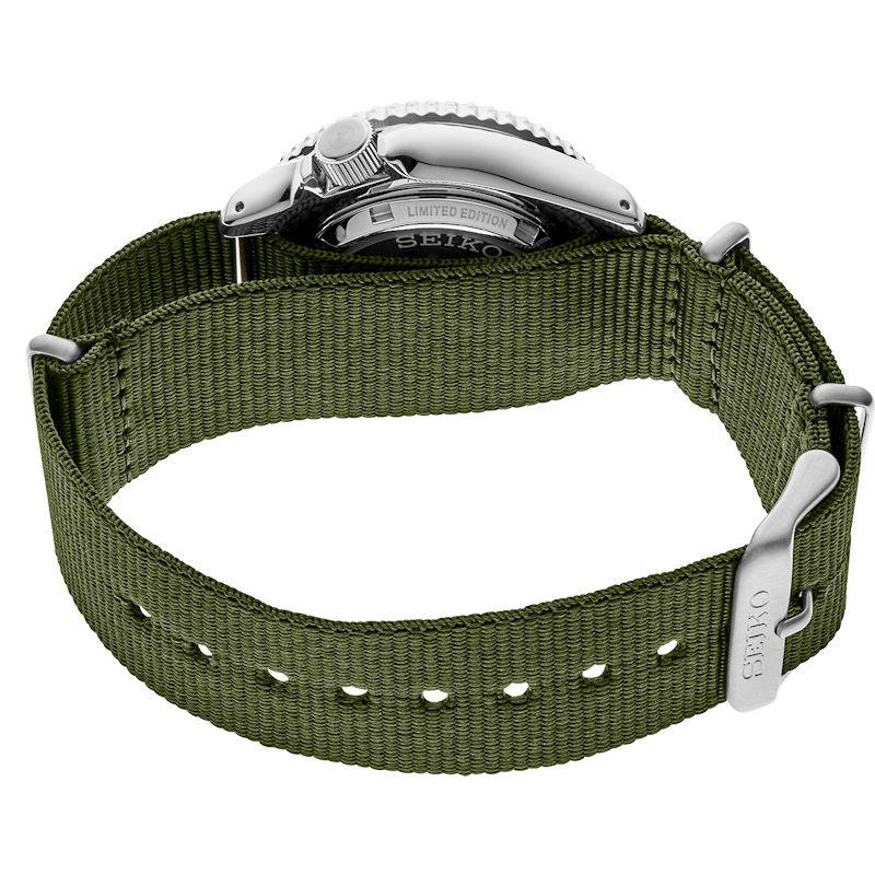 Seiko 5 sports series model SRPJ19. Japanese made Seiko 4R36 automatic movement with day/date function. Stainless steel case. Uni-directional bezel with khaki and brown colored 60 minute insert. Black dial with LumiBrite hands and markers. Water resistant to 100 meters. Green color "NATO" style nylon strap. Limited Edition of 1000 pieces Worldwide.