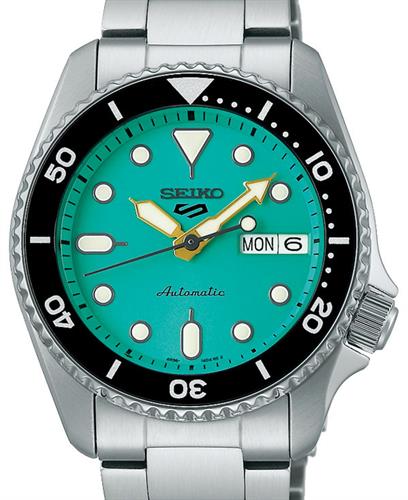 Seiko 5 SKX Sports Style model SRPK33. Japanese made Seiko 4R36 automatic movement with day/date functions. Stainless steel case and bracelet in a new smaller 38mm size. Vibrant green dial with LumiBrite hands and markers. Uni-directional bezel with black 60 minute insert. Hardlex mineral glass crystal. Water resistant to 100 meters.