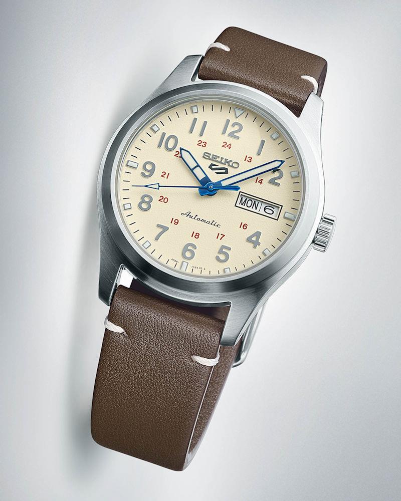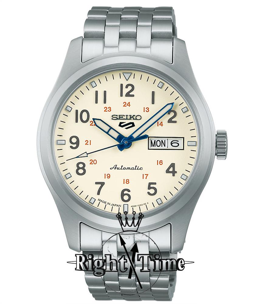 Seiko 5 sports field model SRPK41. Limited edition of 6000 pieces Worldwide. Seiko 4R36 automatic movement with day/date function. Solid stainless steel case and bracelet. Comes with an additional brown leather strap. Cream color Arabic dial with LumiBrite filled hands/markers. Hardlex mineral glass crystal.