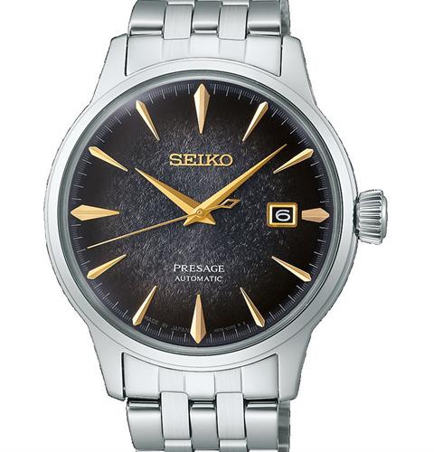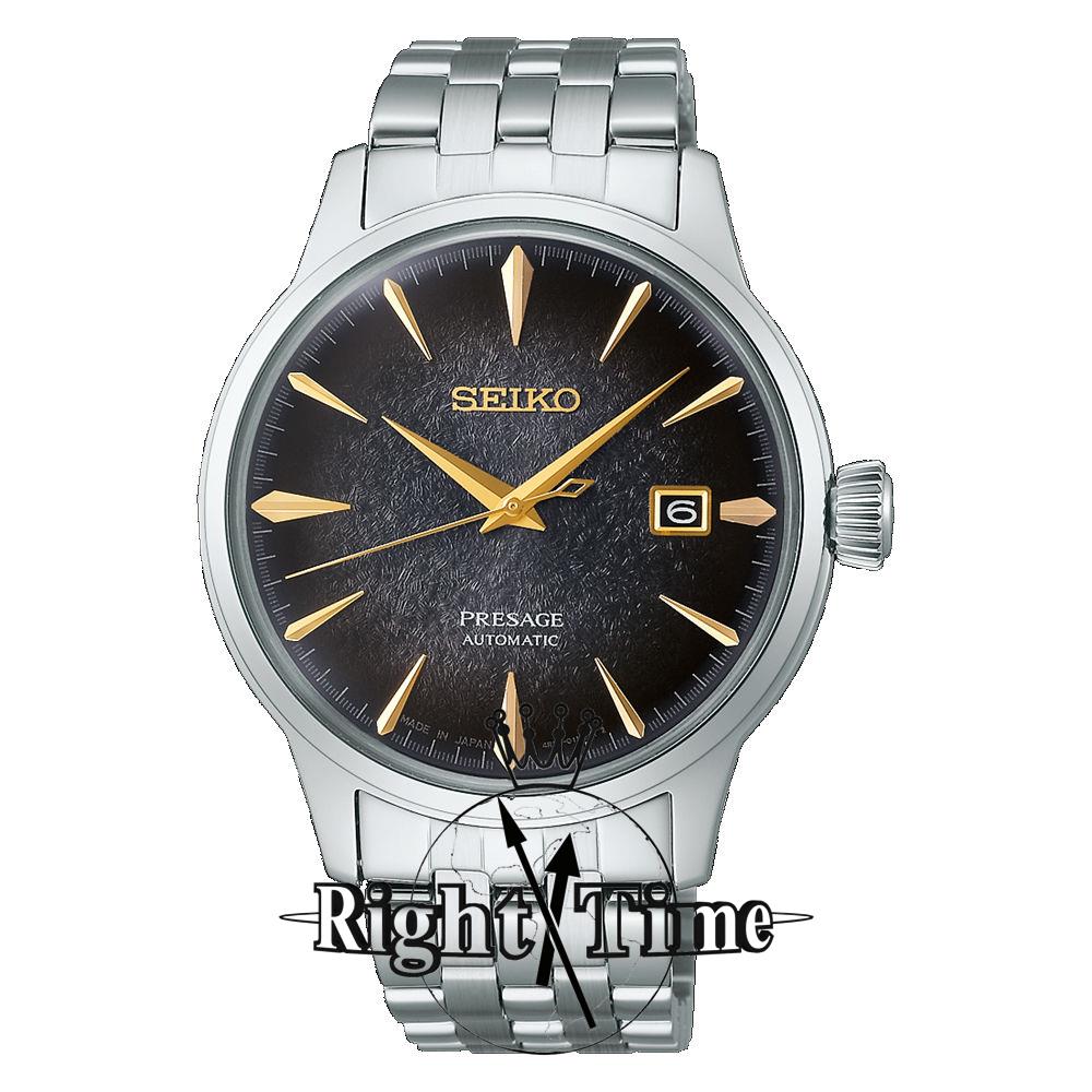 Seiko Presage cocktail time model SRPK93. Limited Edition of 9000 pieces. Stainless steel case. Black Star Bar dial with yellow gold tone hands and markers. Domed mineral glass crystal. Steel bracelet. Seiko Cal 4R35 automatic movement with date.