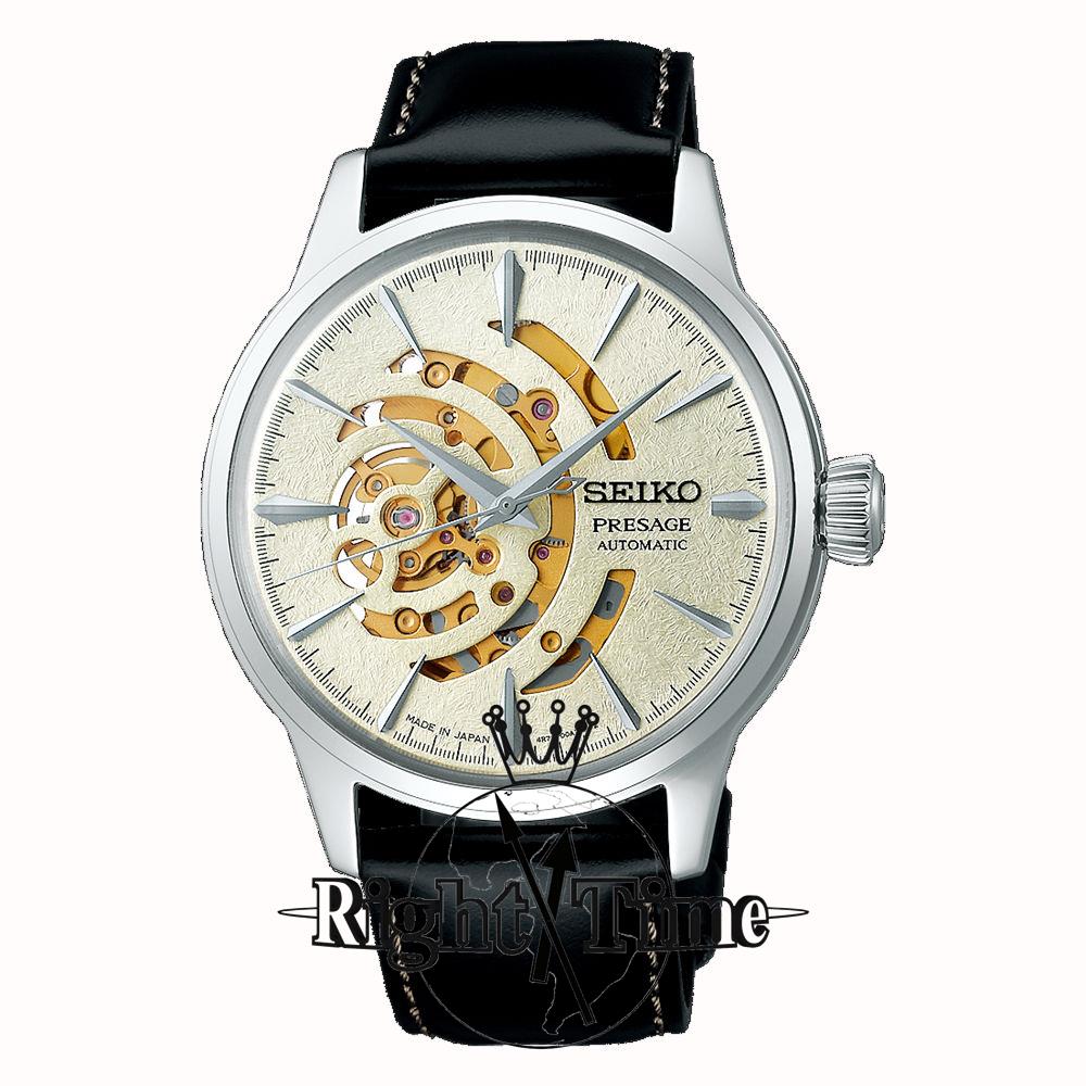 Seiko Presage Cocktail Time STAR BAR Limited Edition watch model SSA455. 50m Water Resistant. SEIKO Japanese made 24 jewel Automatic movement 4R72. 40.5mm stainless steel case, screw-down crown and observation case back. Partially skeletonized champagne color dial. Black leather band.