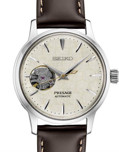 Seiko Presage Cocktail Time Limited Edition watch model SSA781. 50m Water Resistant. SEIKO Japanese made 23 jewel Automatic movement 4R38. 34mm stainless steel case, screw-down crown and observation case back. Brown leather strap
