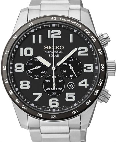 Seiko Core Solar Chronograph watch model SSC229. Stainless steel round case. Black color dial with Arabic numerals. Date calendar. 24-hours hand. Steel bracelet.