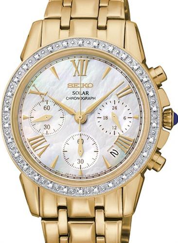 Seiko Solar Chronograph watch model SSC890. Gold plated stainless steel round case with bracelet and crystal decorated bezel. White Mother-of-Pearl dial with gold tone Roman numerals. Date calendar.