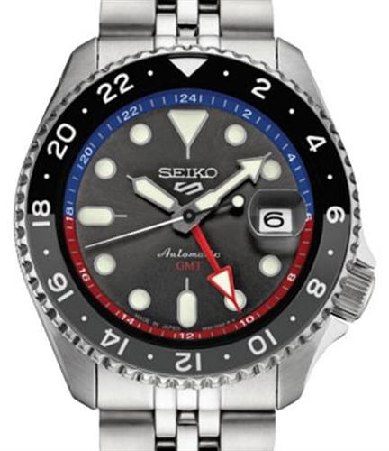 Seiko 5 sport model SSK019. Seiko caliber 4R34 automatic movement with date and GMT functions. Solid stainless steel case and jubilee style bracelet. Grey dial with red/blue chapter ring. LumiBite filled hands and markers. Duo-directional rotating bezel with black/grey 24 hour insert. Hardlex mineral glass crystal. Water resistant to 100 meters.