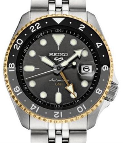 Seiko 5 sport model SSK021. Seiko caliber 4R34 automatic movement with date and GMT functions. Solid stainless steel case and jubilee style bracelet. Grey dial with black chapter ring. LumiBite filled hands and markers. Gold PVD duo-directional rotating bezel with black/grey 24 hour insert. Hardlex mineral glass crystal. Water resistant to 100 meters.