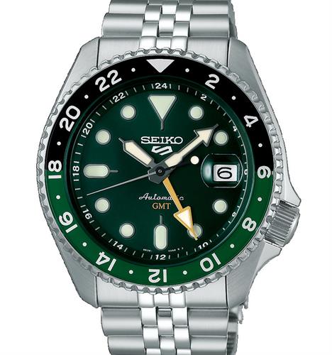 Seiko 5 sport model SSK035. Seiko caliber 4R34 automatic movement with date and GMT functions. Solid stainless steel case and jubilee style bracelet. Green color dial with LumiBite filled hands and markers. Duo-directional rotating bezel with black 24 hour insert. Hardlex mineral glass crystal. Water resistant to 100 meters.