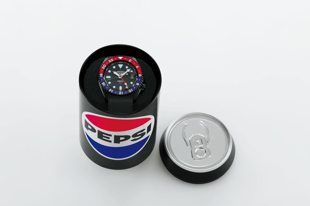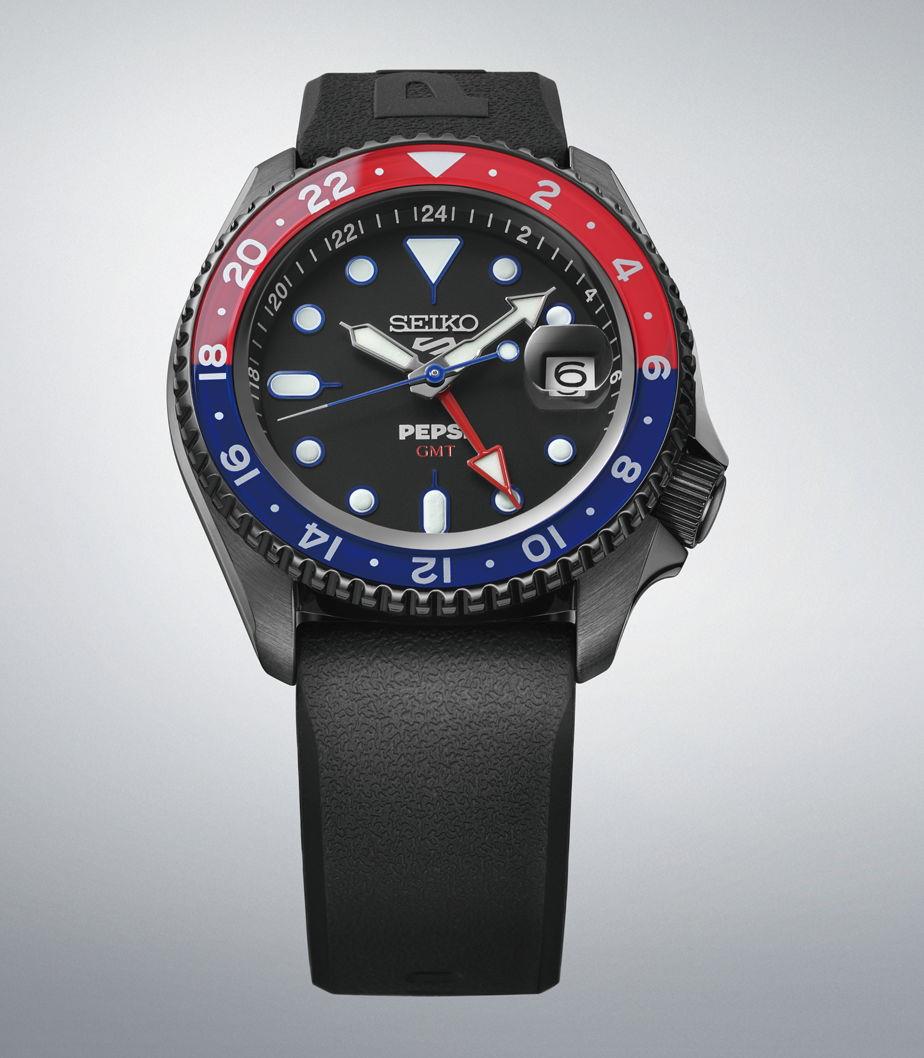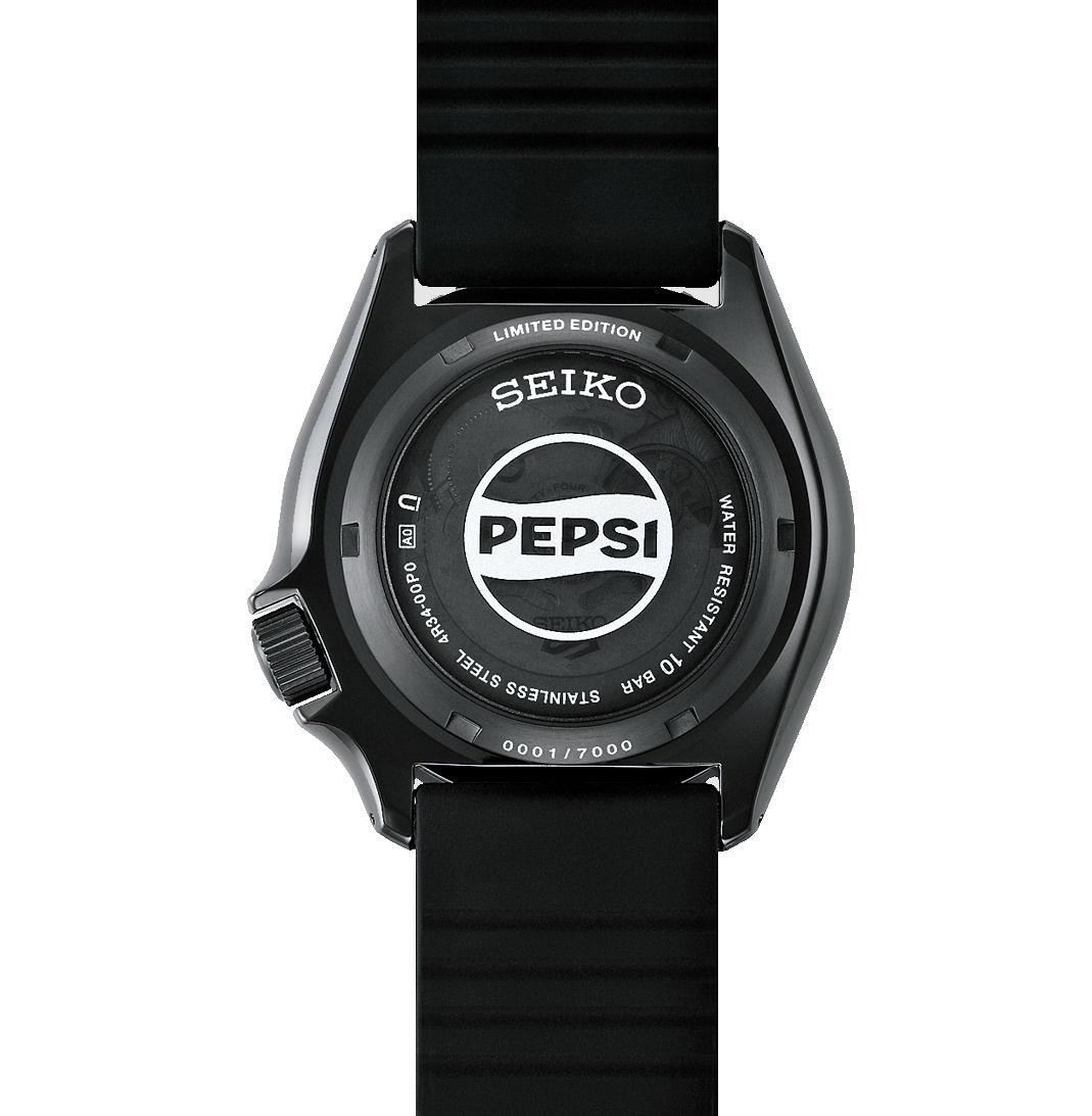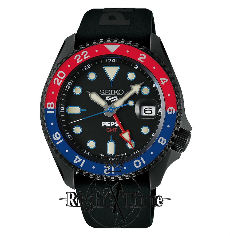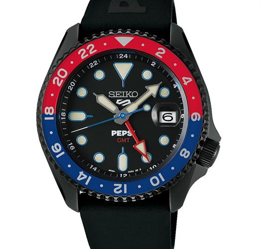 Seiko 5 SKX series "Pepsi" Limited Edition model SSK047. Limited to 7000 pieces Worldwide. Japanese made Seiko 4R34 automatic movement with date and GMT function. Black plated stainless steel case with rubber band. Black dial with LumiBrite filled hands and markers. Hardlex mineral glass crystal with bubble date magnifier. Smooth rotating duo-directional "Pepsi" bezel with blue and red 24 hour insert. Water resistant to 100 meters.