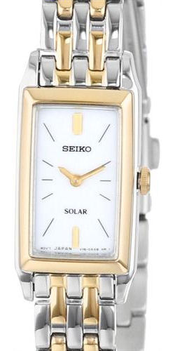 Seiko quartz solar powered watch model SUP028. Stainless steel rectangular 2-tone case with bracelet. White color dial