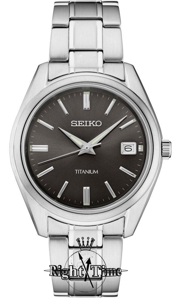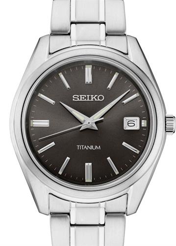 Seiko watch model SUR375 from Seiko Essentials Collection. Titanium case and watch bracelet, black color dial with luminous hands. 100 meters water resistant