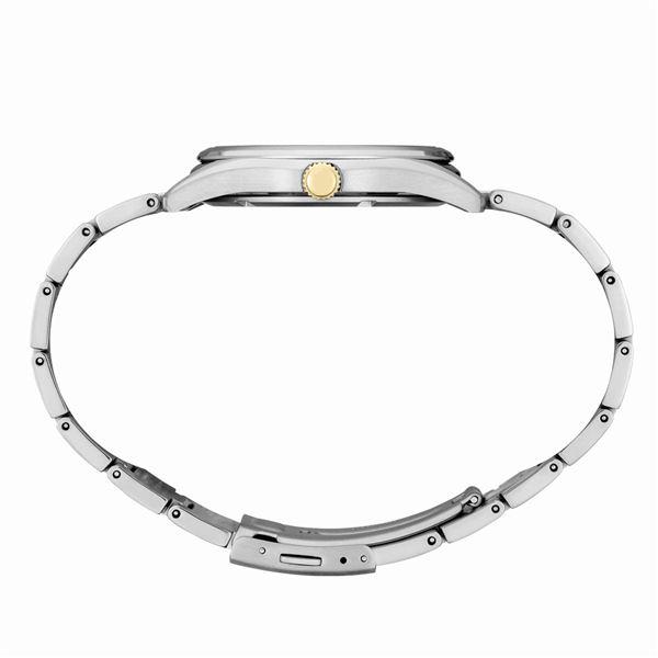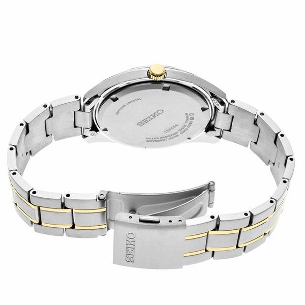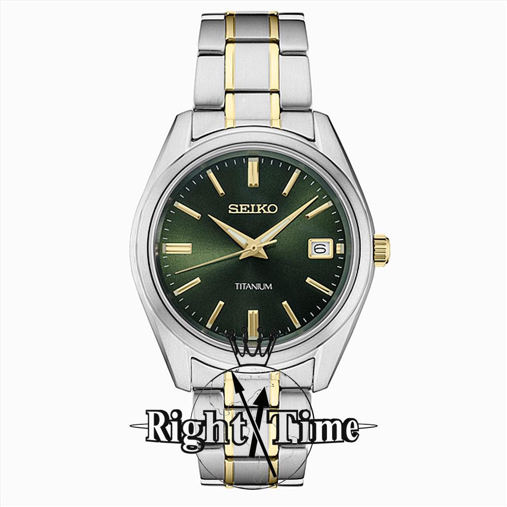 Seiko watch model SUR377 from Seiko Essentials Collection. Titanium case and watch bracelet with yellow gold plated accents, green color dial with luminous hands. 100 meters water resistant