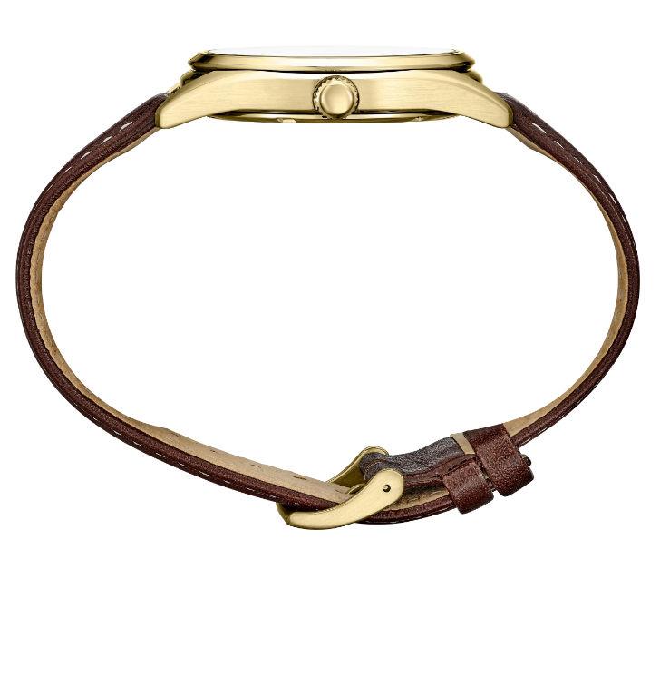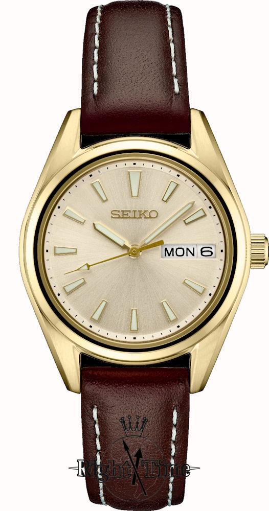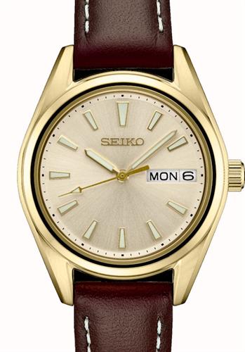 Seiko watch model SUR456 from Seiko Essentials Collection. Stainless steel 30mm gold plated case with brown leather band, champagne color dial with luminous hands and markers. 100 meters water resistant