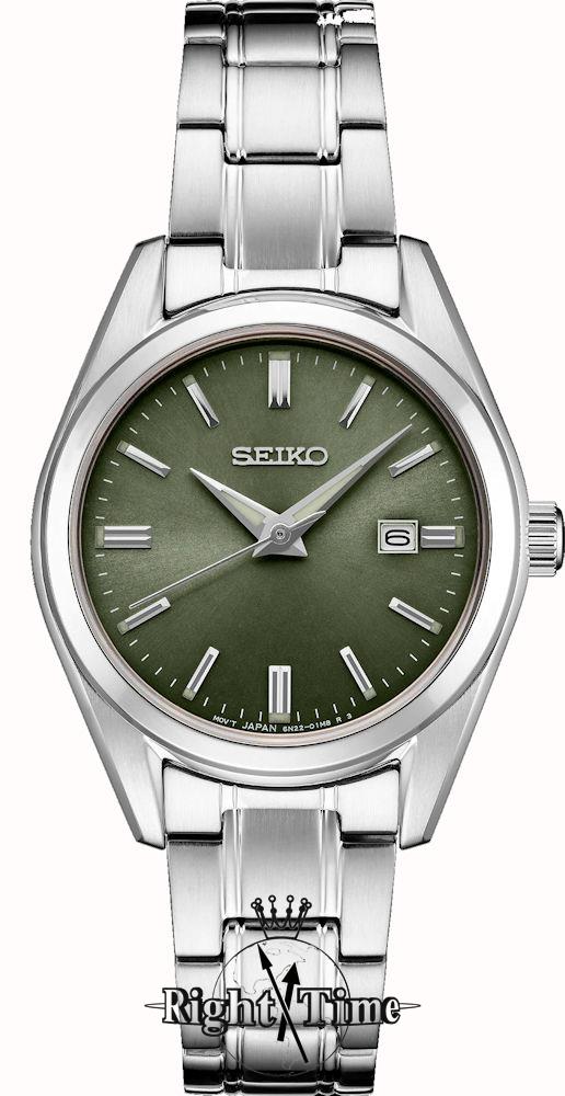 Seiko watch model SUR533 from Seiko Essentials Collection. Stainless steel 30mm case and watch bracelet, green color dial with luminous hands. 100 meters water resistant
