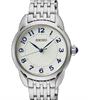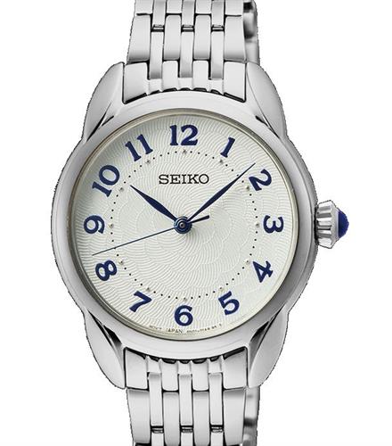 Seiko Essential quartz powered watch model SUR561. Stainless steel case with bracelet. Silver tone dial with blue Arabic numerals.
