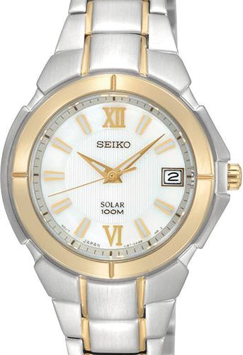 Seiko ladies watch model SUT022. Solar powered movement. Stainless steel case and watch bracelet with gold plated accents, white dial. 100 water resistant.