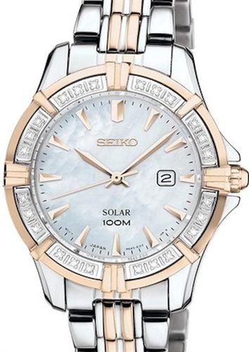 Seiko Solar powered wrist watch model SUT072. SEIKO Japanese Quartz movement with Day calendar. Stainless steel case with gold plated accents and 24 diamonds on the bezel. Mother-of-Pearl dial. Stainless steel bracelet with gold plated accents