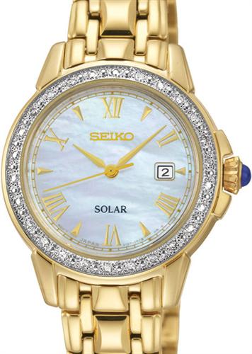 Seiko Solar powered wrist watch model SUT172. SEIKO Japanese Quartz movement with Day calendar. Gold plated stainless steel case with diamonds on the bezel. Mother-of-Pearl dial. Stainless steel gold plated bracelet