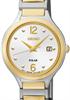 Seiko Solar powered wrist watch model SUT178. SEIKO Japanese Quartz movement with Day calendar. Gold plated accents on stainless steel case and bracelet. White dial.