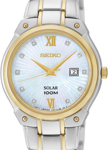 Seiko quartz solar powered dress watch model SUT214. Stainless steel case and bracelet with gold tone accents. Mother-of-Pearl dial with date and diamond markers. Water resistant to 100 meters