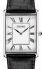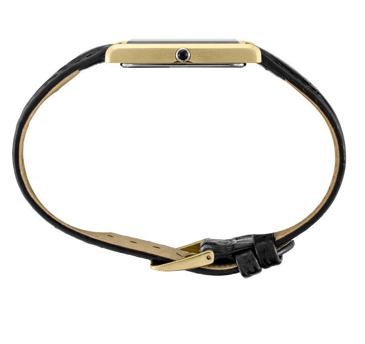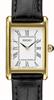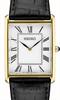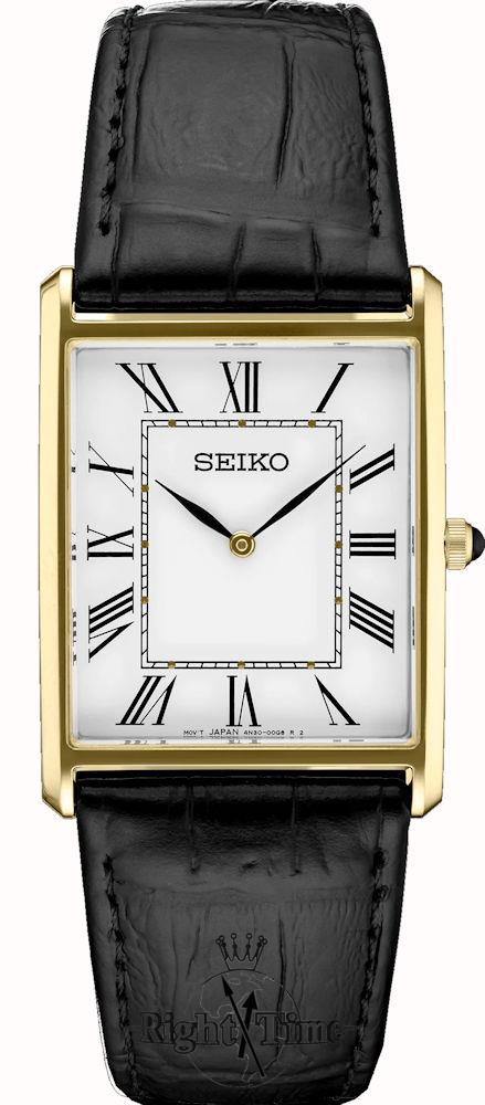 Seiko watch model SWR052 from Seiko Essentials Collection. 28.5mm tank style gold plated stainless steel case, white Roman dial. Black leather strap. 30 meters water resistant