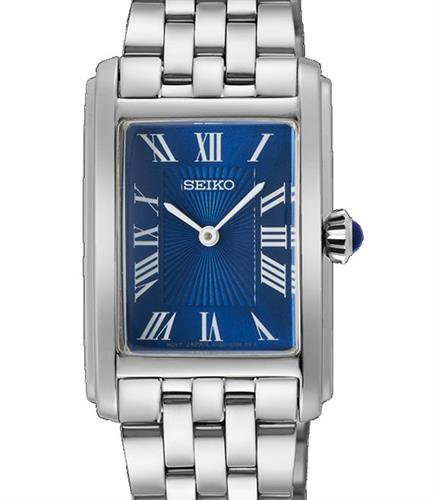 Seiko watch model SWR085 from Seiko Essentials Collection. 22mm tank style stainless steel case and bracelet, blue Roman dial. 50 meters water resistant