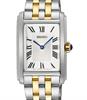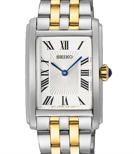 Seiko watch model SWR087 from Seiko Essentials Collection. 22mm tank style stainless steel case and bracelet with gold tone accents, white Roman dial. 50 meters water resistant