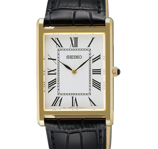 Seiko watch model SWR104 from Seiko Essentials Collection. Tank style gold plated stainless steel case with black leather band, white Roman dial. 50 meters water resistant