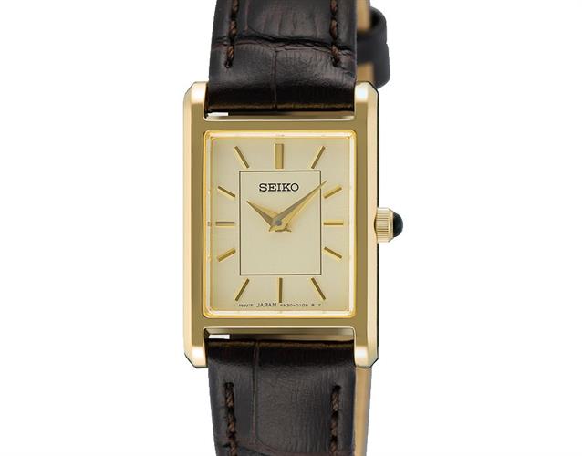 Seiko watch model SWR110 from Seiko Essentials Collection. Tank style stainless steel gold plated case with dark brown leather band, Champagne color dial. 50 meters water resistant