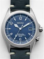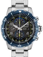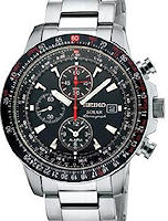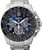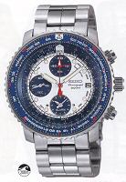 Seiko model SNA413 Pilot Alarm Chronograph. SEIKO Japanese Quartz chronograph movement with Second Time Zone and Alarm functions. Blue color bi-directional bezel with E6B navigational slide rule for calculation of distance and fuel consumption. Stainless steel case and watch bracelet. White color dial with Tachymetre scale, date calendar and blue sub-dials.