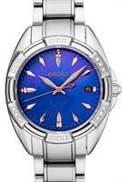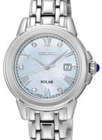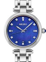 Seiko watch model SKK881 from Seiko Diamonds Collection. Stainless steel case and watch bracelet, 18 diamonds, blue Mother-of-Pearl dial with date, sapphire crystal.
